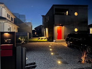 シンプルなグレーのカラーリングの中の赤い玄関のドアがインパクトのある事例です。昼間はもちろん、夜には照明が当たって昼間とはまた違う印象を見せてくれます。